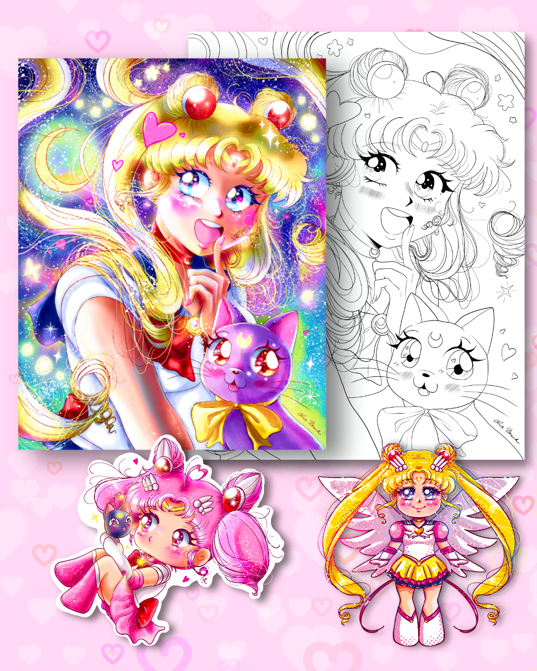 Fun Sailor Moon bundle including a 8.5 x 11 glossy print, 8.5 x 11 coloring line art page on cardstock, and 2 4inch stickers!